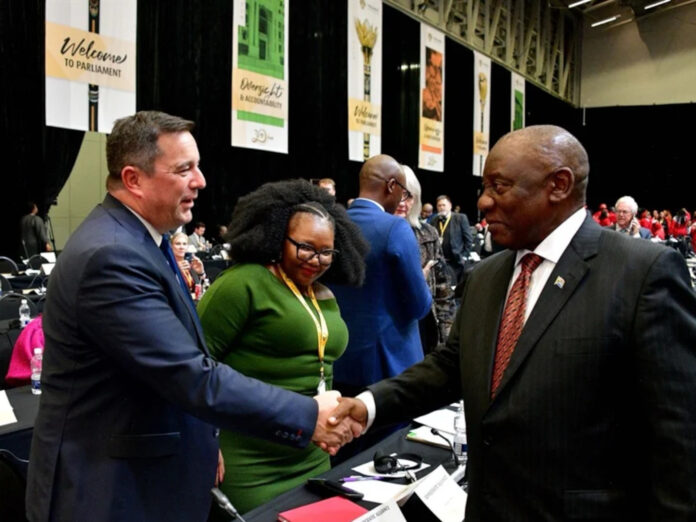 Abasesithombeni ngenhla: UCyril Ramaphosa kanye nomholi we-DA uJohn Steenhuisen.